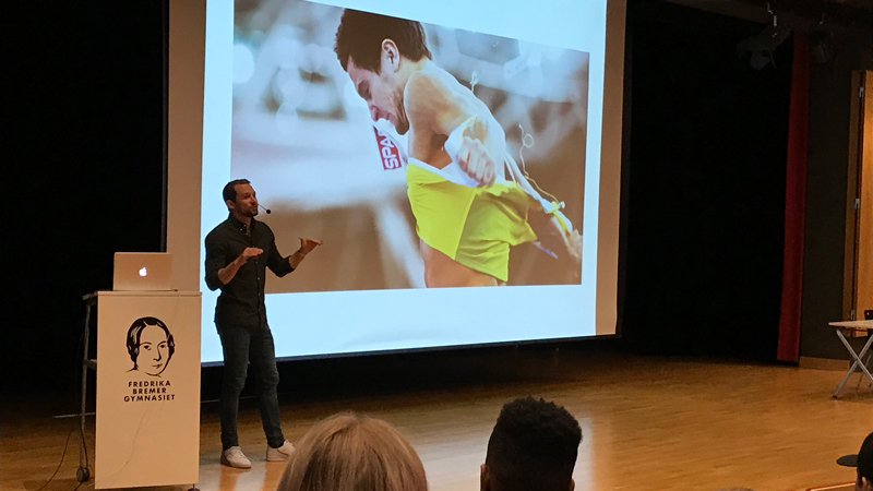 Linus Thörnblad föreläste i Fredrika Bremergymnasiets aula för alla elever på våra idrottsakademier. Linus berättade bla om sina framgångar, men också personligt om motgångar och hård press inom elitidrotten.